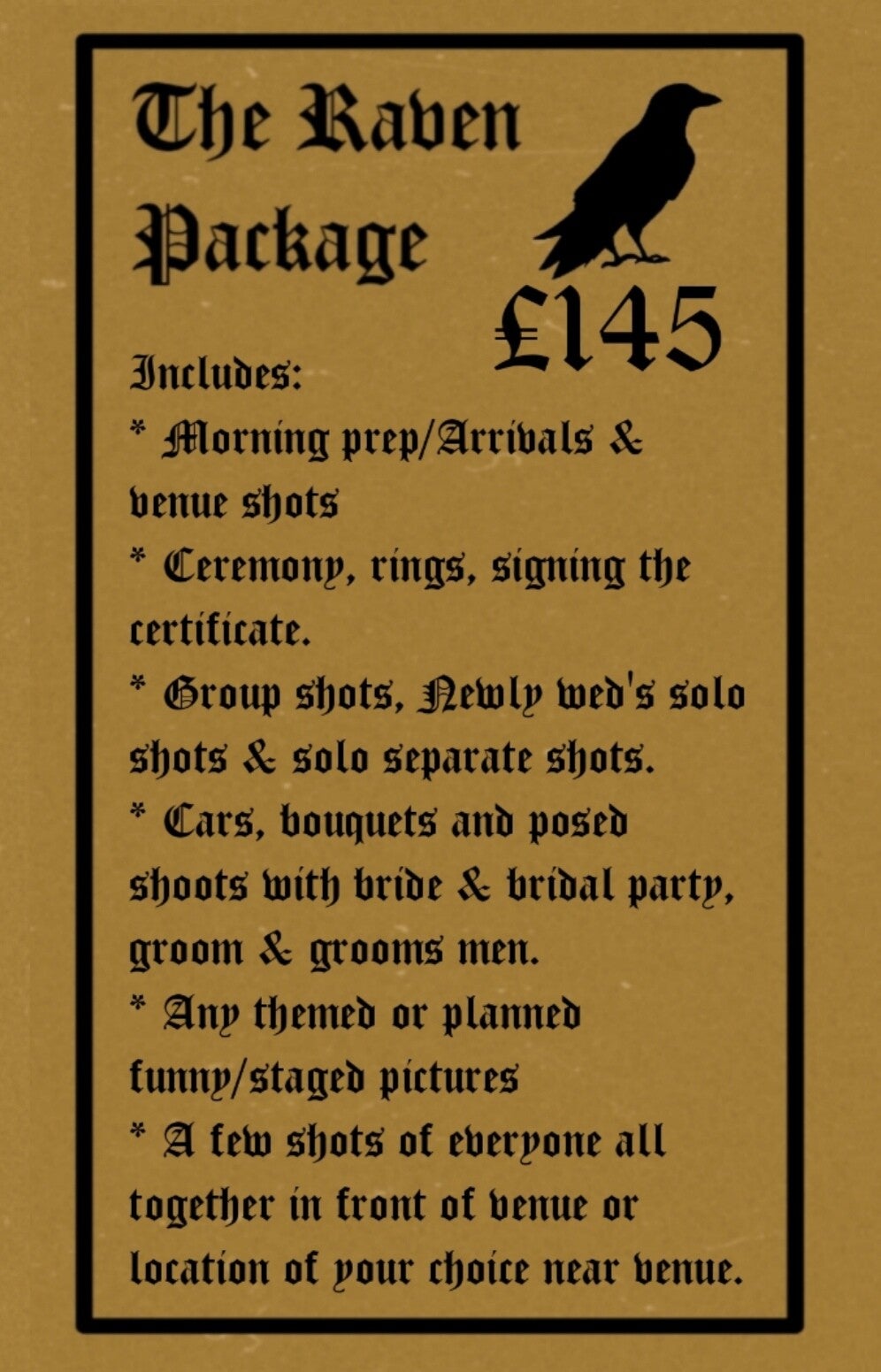 - This package includes photographs of the ceremony and more photographs of the couple and the guests. A deposit of £75 needs to be paid when booking in. This package includes: