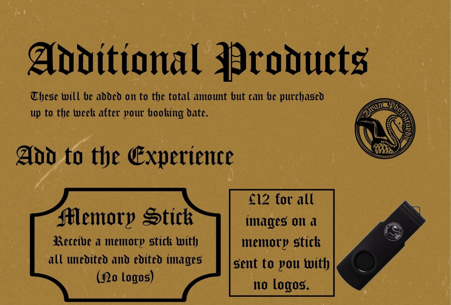 Add this to your package and receive all your images on a USB memory stick to download your images to your tablets/laptop.